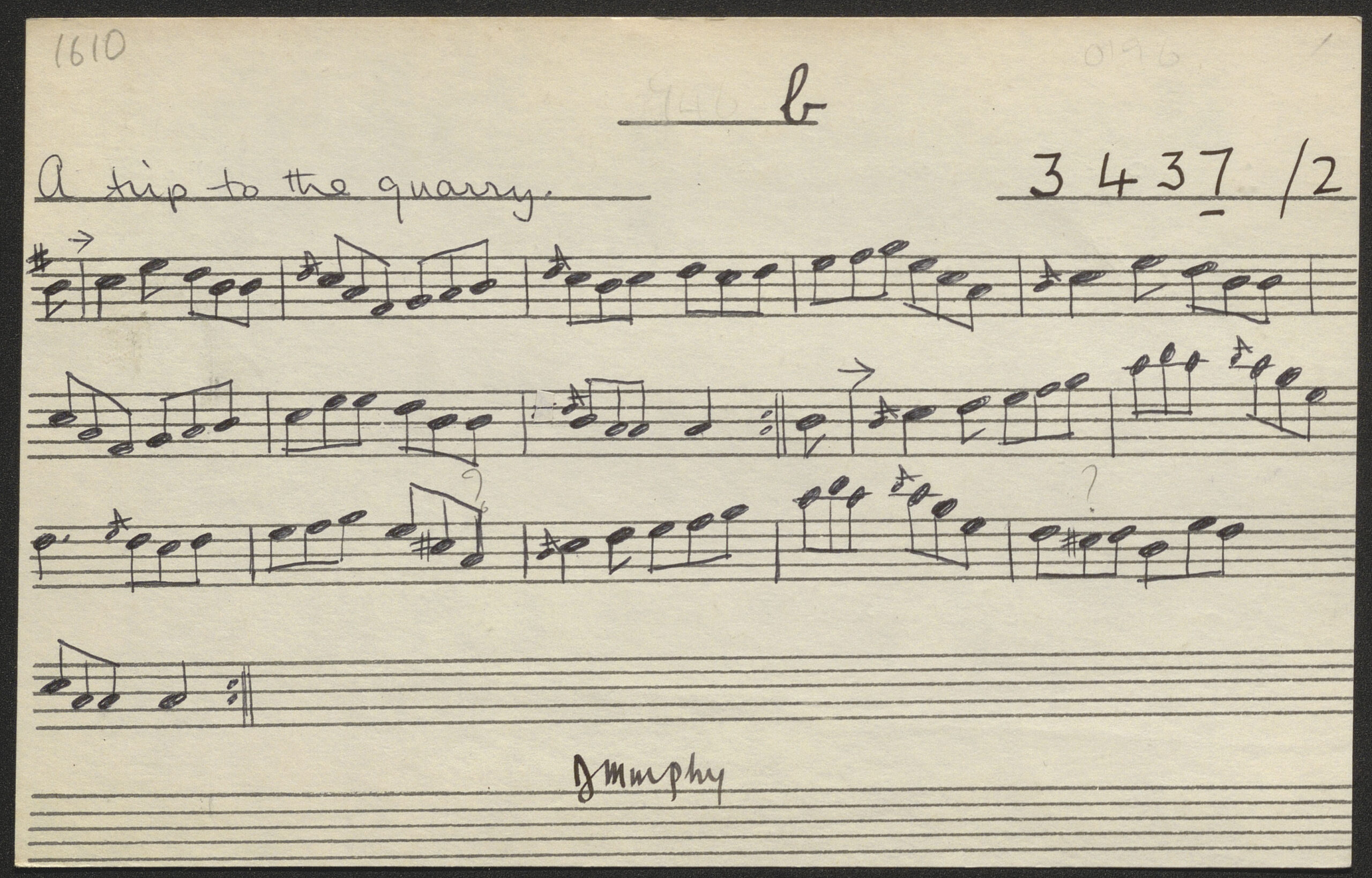 A trip to the quarry, jig [composed by Thady Murphy]. CICD 1610. Collected in Co. Kerry in 1967.