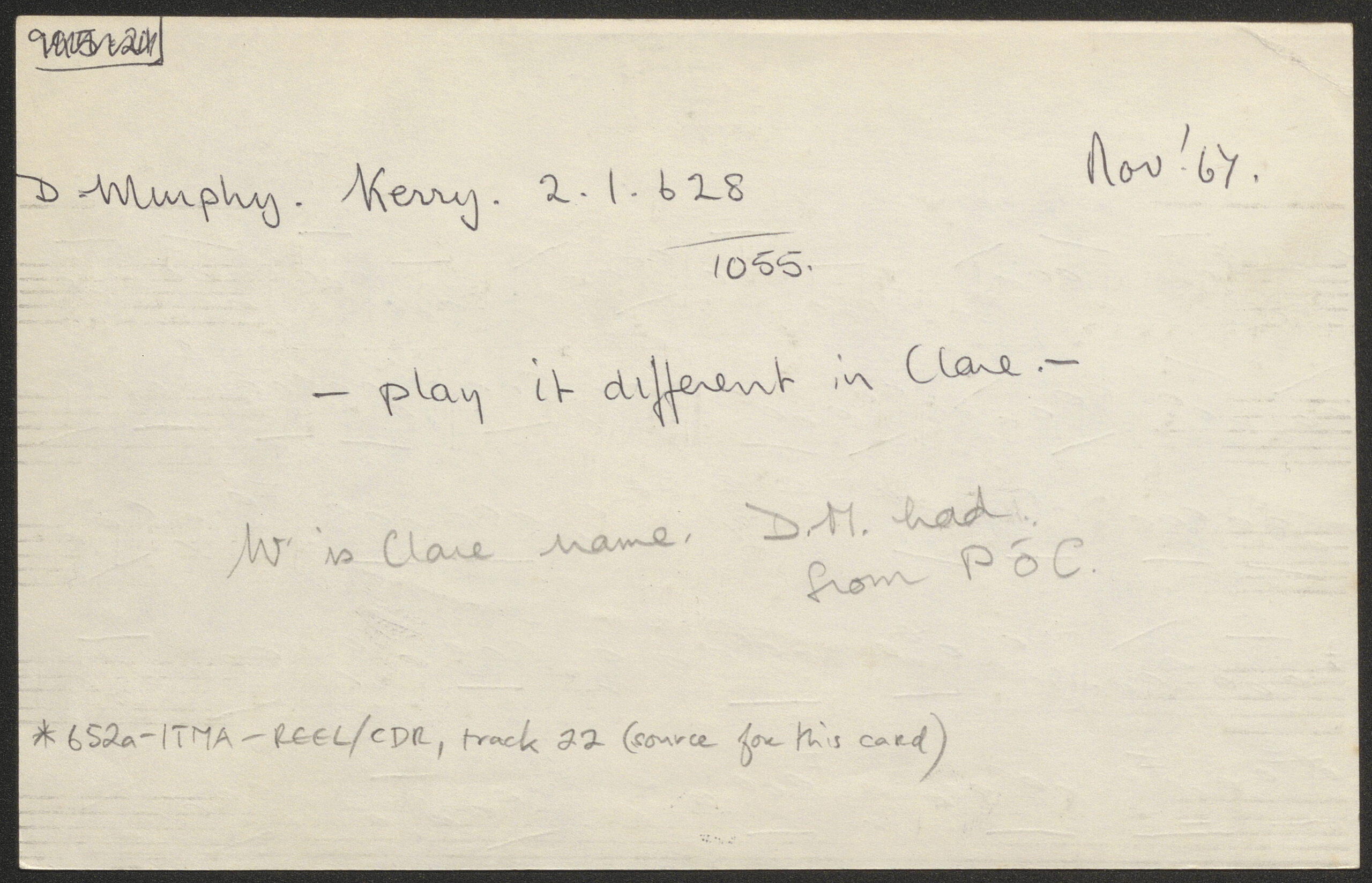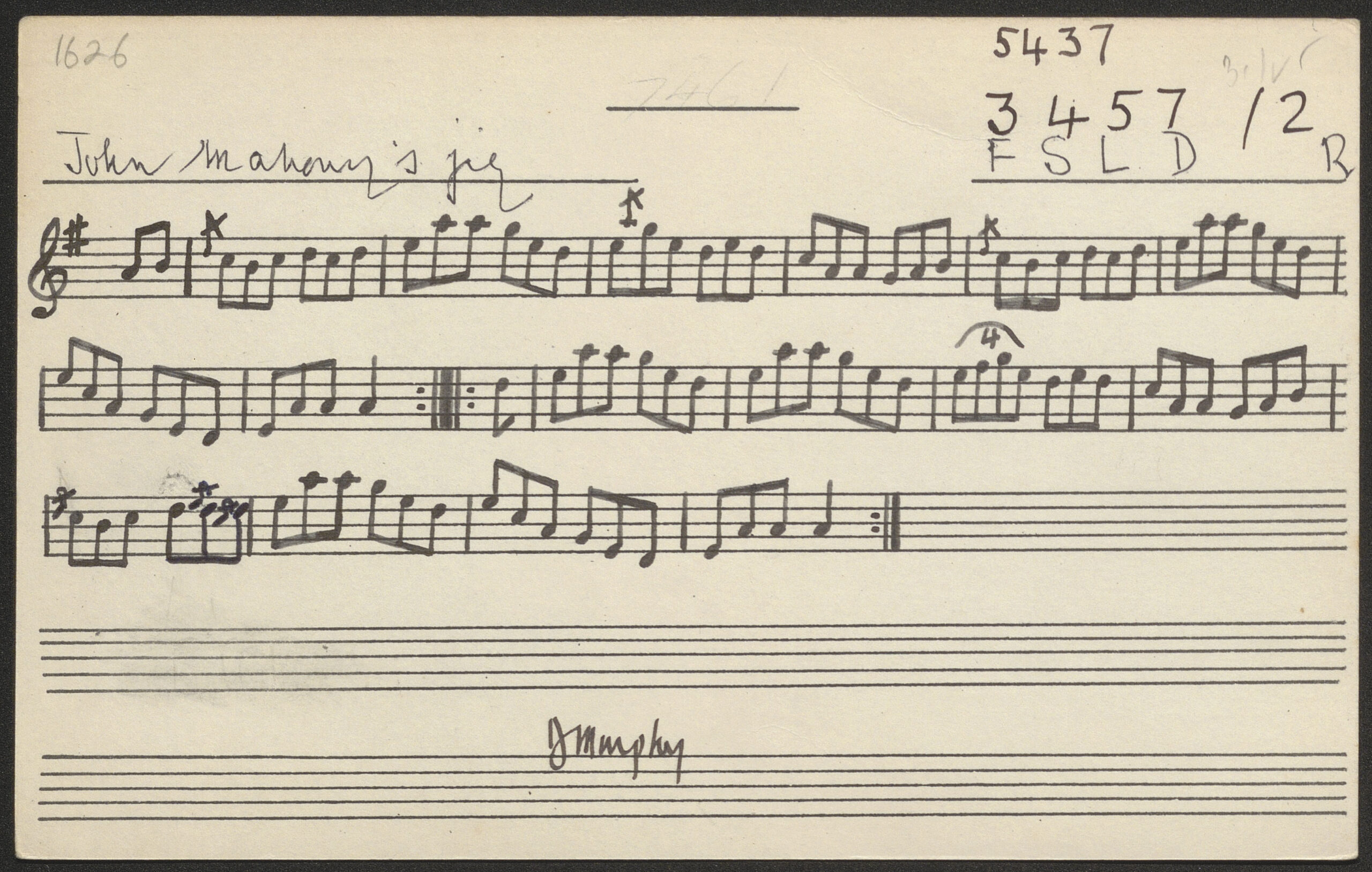 John Mahony's [Lucy McKenna, version of?], jig. CICD 1626. Collected in Co. Kerry in 1966.