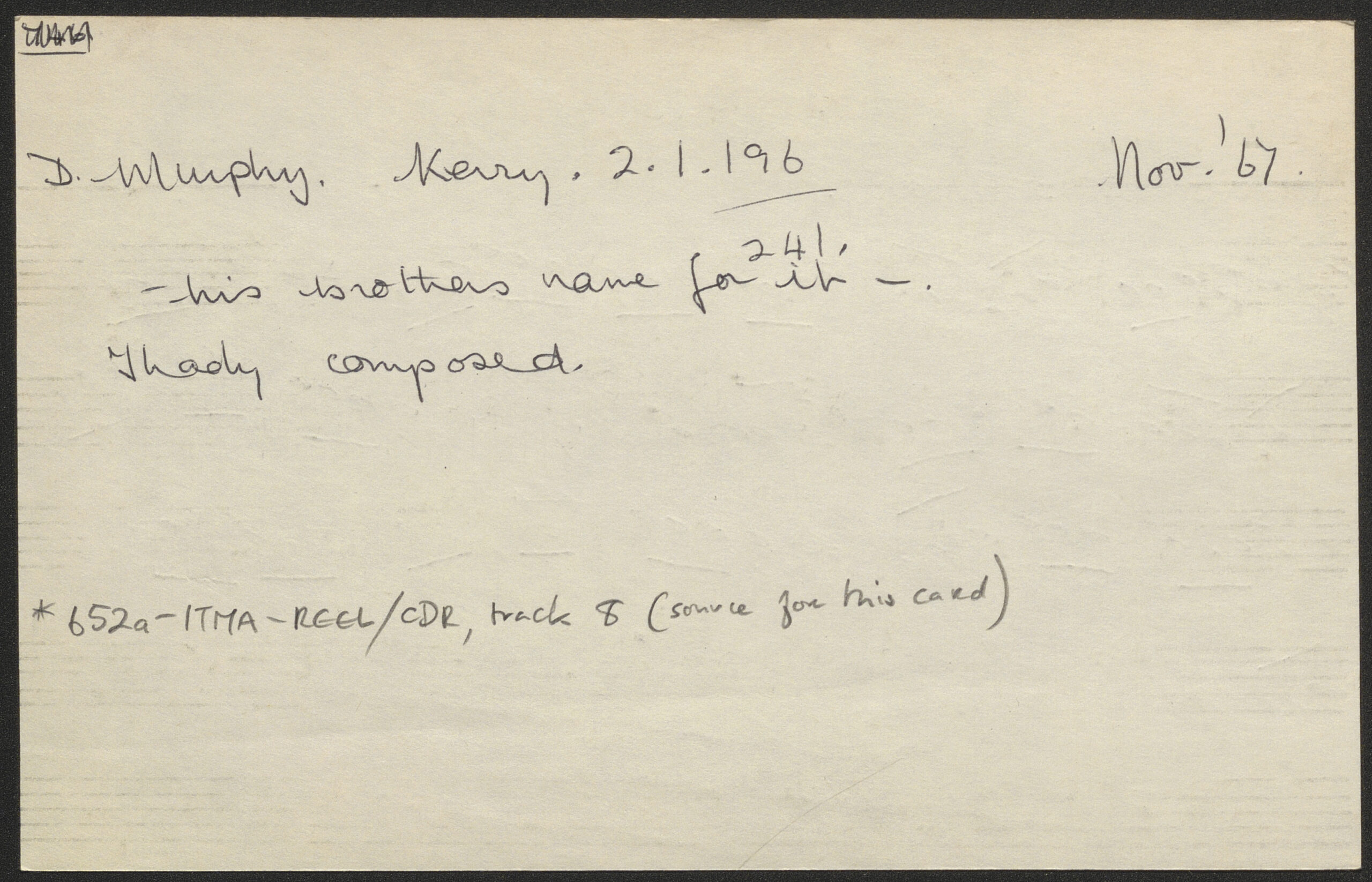 A trip to the quarry, jig [composed by Thady Murphy]. CICD 1610 (reverse side). Collected in Co. Kerry in 1967.