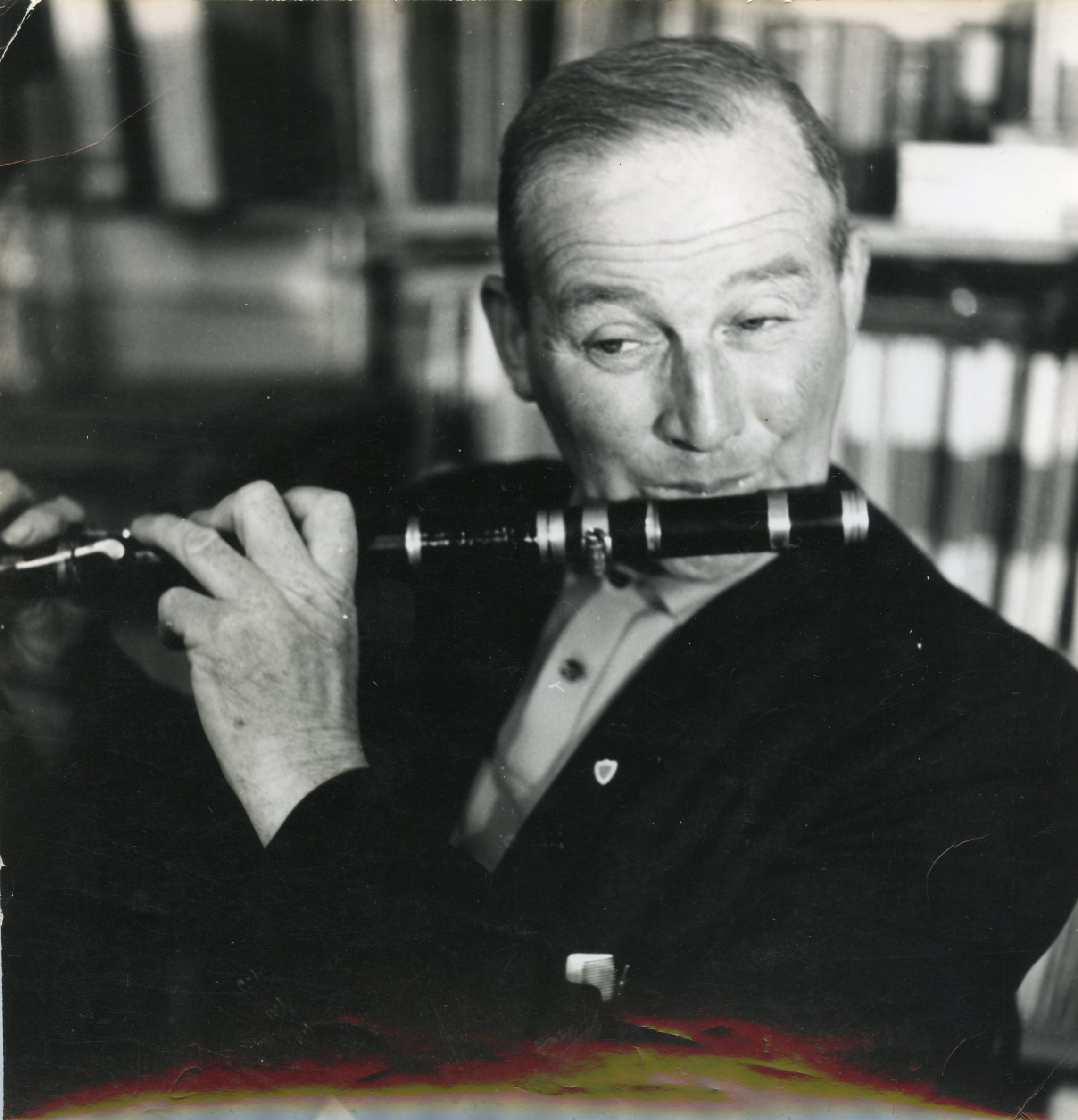 Black and white photo of Breandán Breathnach speaking in front of a microphone wearing a suit.